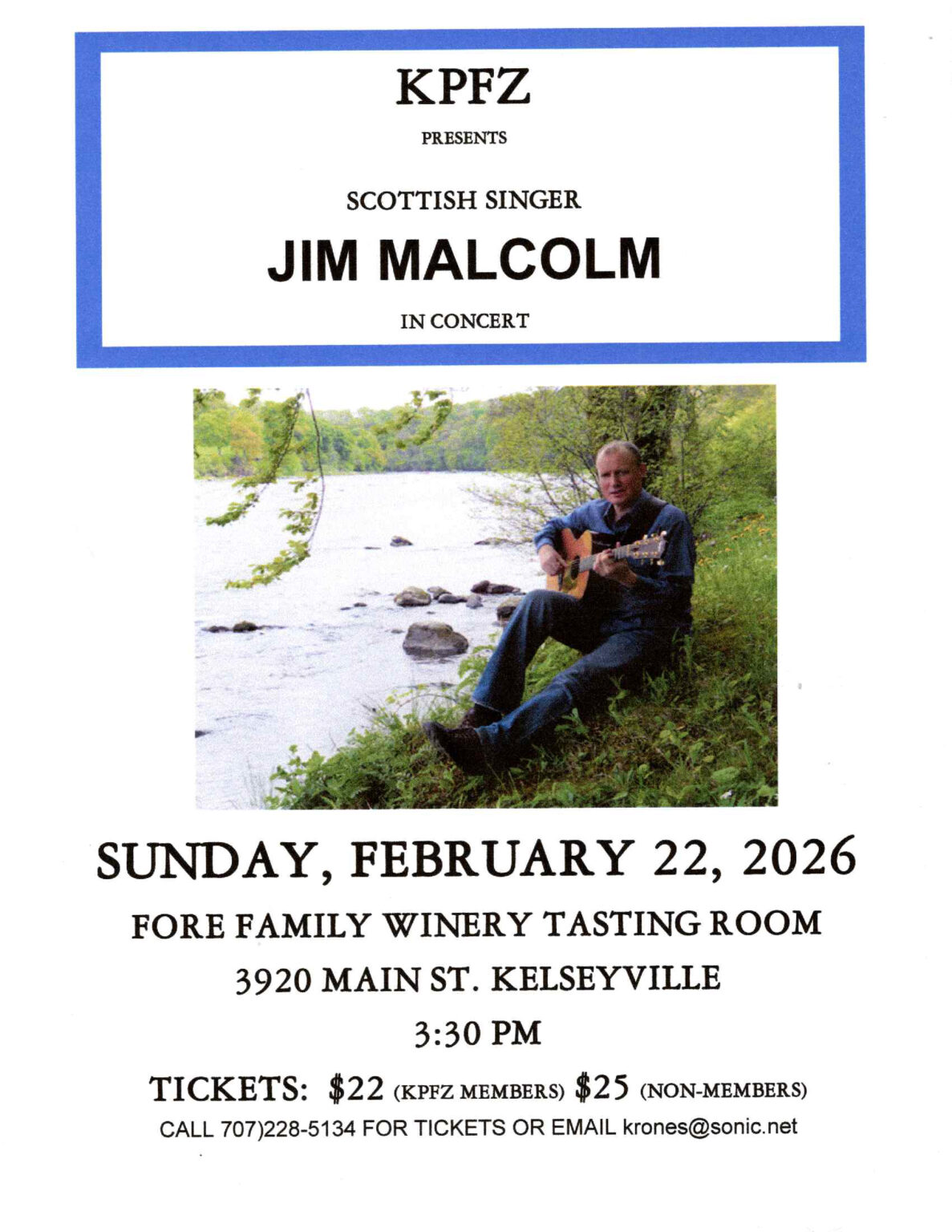 Jim Malcom Concert- Fore Family + Add to Google Calendar + iCal / Outlook export 00 days 00 hours 00 minutes 00 seconds Date Feb 22 2026 Time 3:30 pm - 6:00 pm Cost $25.00 Location Fore Family Vineyards Wine Room 3924 Main St Kelseyville Website http://www.forefamilyvineyards.com Share this event