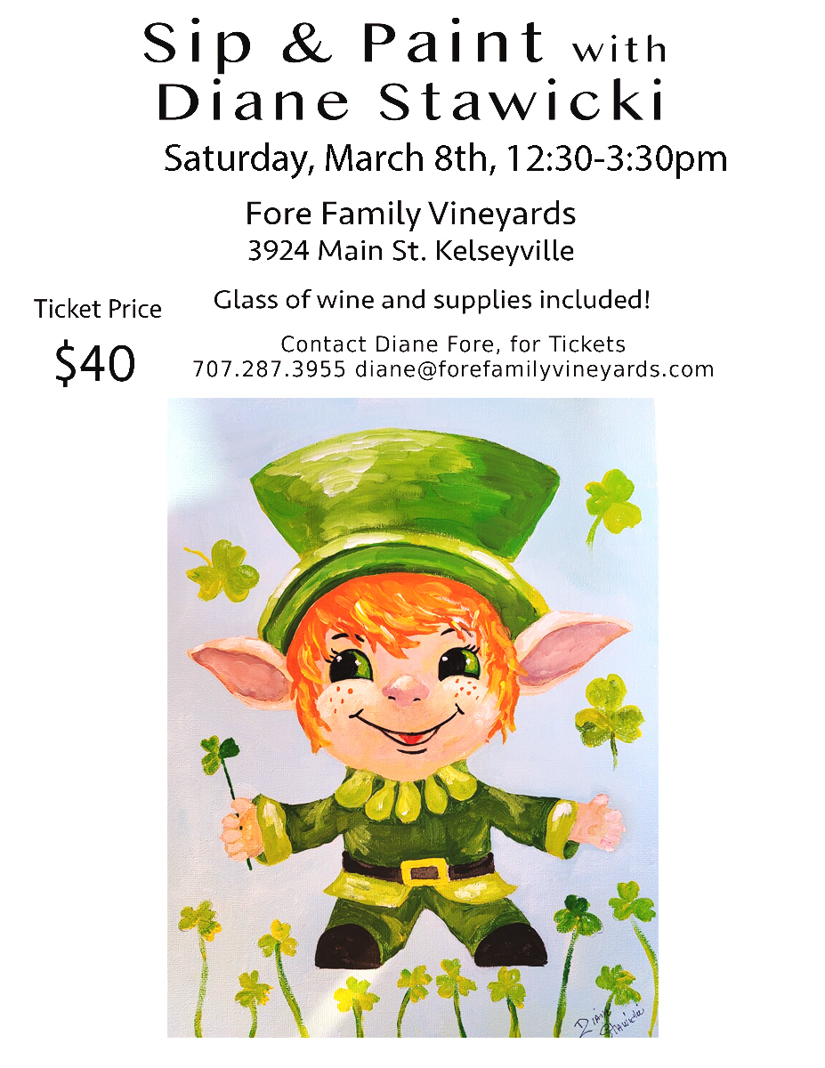 Sip & Paint- Fore Family + Add to Google Calendar + iCal / Outlook export 00 days 00 hours 00 minutes 00 seconds Date Mar 08 2026 Time 12:30 pm - 3:30 pm Location Fore Family Vineyards Wine Room 3924 Main St Kelseyville Website http://www.forefamilyvineyards.com Share this event